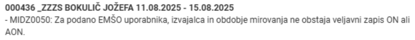 Zapis mirovanja lahko pošljemo na ZZZS samo za osebe, katere imajo predhodno sprejet osebni načrt. V primeru neupoštevanja navedenega pravila, prejmete zavrnitev MIDZ0050.